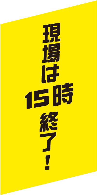 朝は6時~7時には置場に集合して現場へ向かいます。終業は15時~16時なので夕方からは自分の時間がたっぷりと取ることができるのが魅力です。